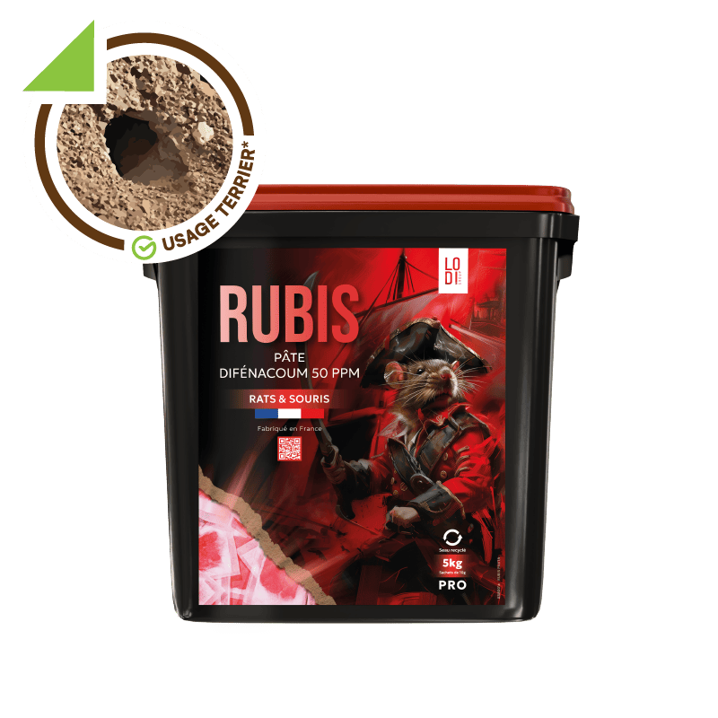 À base de Difénacoum (0,005%), un puissant anticoagulant, RUBIS Pasta agit efficacement sur les rats et les souris.