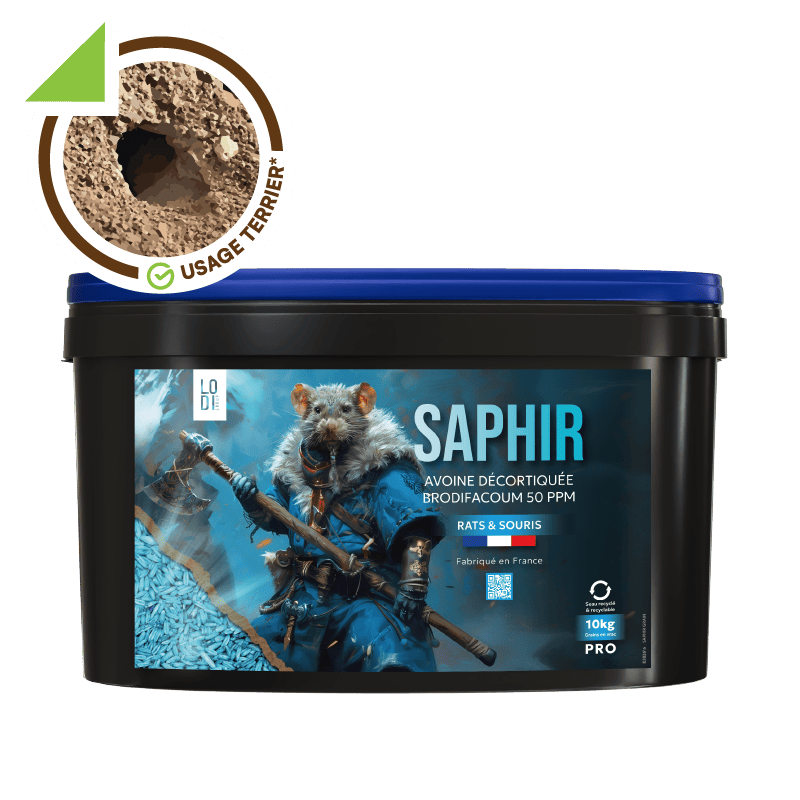 Informations réglementaires Type de produit Type de formulation Substance active Concentration Amérisant Nom homologué N° d’AMM Organismes ciblés Application TP14 – Rodenticide Appât sur grain, prêt à l’emploi (RB) Brodifacoum N°CAS 56073-10-0 0,005% m/m Benzoate de denatonium 10ppm SAPHIR GRAIN FR-2014-0097 - Professionnels de la lutte contre les rongeurs Rats bruns (Rattus norvegicus) Rats noirs (Rattus rattus) Souris domestiques (Mus musculus) Utilisation en intérieur, autour des bâtiments / en zones ouvertes extérieures, directement dans les terriers, décharge et déchetteries (rats uniquement).