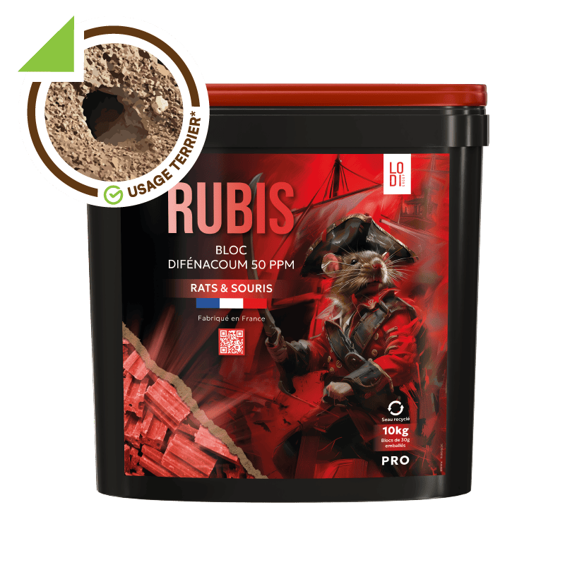 Type de produit Type de formulation Substance active Concentration Amérisant Nom homologué N° d’AMM Organismes ciblés Application TP14 – Rodenticide Appât en bloc, prêt à l’emploi (RB) Difenacoum N°CAS 56073-07-5 0,005% m/m Benzoate de denatonium 10ppm RUBIS BLOC FR-2012-0031 - Professionnels de la lutte contre les rongeurs Rats bruns (Rattus norvegicus) Rats noirs (Rattus rattus) Souris domestiques (Mus musculus) Utilisation en intérieur, autour des bâtiments / en zones ouvertes extérieures, directement dans les terriers, décharge et déchetteries (rats uniquement) et dans les égouts (Rattus norvegicus)
