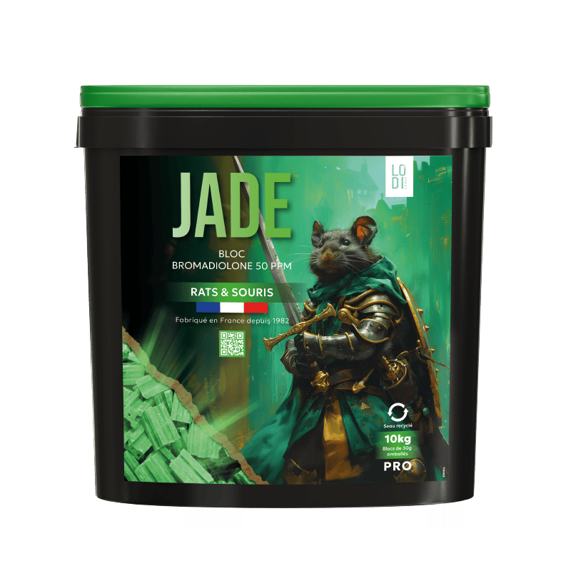Type de produit Type de formulation Substance active Concentration Amérisant Nom homologué N° d’AMM Organismes ciblés Application Informations réglementaires TP14 – Rodenticide Appât en bloc, prêt à l’emploi (RB) Bromadiolone (N°CAS 28772-56-7) 0,005% m/m Benzoate de denatonium 10ppm JADE BLOC FR-2014-0137 - Professionnels de la lutte contre les rongeurs. Rats bruns (Rattus norvegicus) Rats noirs (Rattus rattus) Souris (Mus musculus) Utilisation en intérieur, autour des bâtiments / en zones ouvertes extérieures, décharge et déchetteries (rats uniquement), et dans les égouts (Rattus norvegicus)